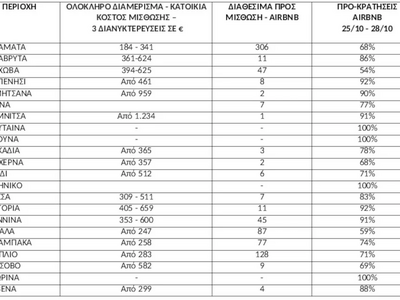 Σύμφωνα με τα στοιχεία της AirDNA, οι προκρατήσεις για το διάστημα 25 έως 28 Οκτωβρίου παρουσιάζουν έντονη άνοδο και αναμένεται να κινηθούν σε ποσοστά 80%-95% πληρότητας, αντίστοιχα με πέρυσι. Παράλληλα, αυξημένος είναι και ο αριθμός των νέων εγγραφών ακινήτων σε αρκετούς προορισμούς της ηπειρωτικής Ελλάδας.
