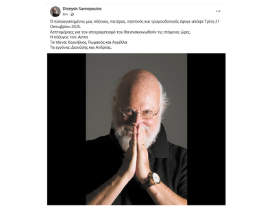 Την ανάρτηση υπογράφουν η σύζυγός του Ασπα, τα παιδιά τους Κορνήλιος και Ρωμανός με τη σύντροφό του Αγγέλλα) και τα εγγόνια Διονύσης και Ανδρέας.