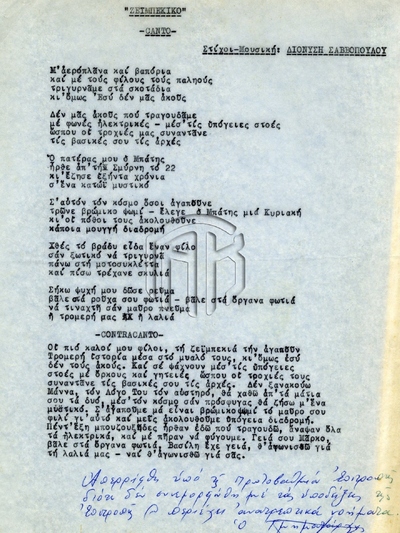 Ο Διονύσης Σαββόπουλος εμφανίστηκε στη μουσική σκηνή της χώρας τη δεκαετία του 1960 και, κυρίως, την περίοδο της δικτατορίας των συνταγματαρχών. Ο Σαββόπουλος, συνδυάζοντας με έναν δικό του τρόπο την ελληνική παραδοσιακή μουσική με το δυτικό ροκ, μίλησε για ζητήματα που απασχολούσαν την αναδυόμενη στον δημόσιο και πολιτικό βίο νεολαία. Την περίοδο της χούντας τα τραγούδια του Σαββόπουλου εκφράζουν τη νεανική κουλτούρα και την κουλτούρα της ελεύθερης έκφρασης και της αντίστασης απέναντι στη ζοφερή πραγματικότητα της δικτατορίας. Ο Σαββόπουλος, όπως και οι υπόλοιποι καλλιτέχνες, έπρεπε να προσπελάσουν το ψαλίδι της λογοκρισίας. Τα τεκμήρια της ανάρτησης αφορούν τη λογοκρισία του εμβληματικού τραγουδιού του Σαββόπουλου «Ζεϊμπέκικο» από την επιτροπή λογοκρισίας της Γενικής Γραμματείας Τύπου και Πληροφοριών το αρχείο της οποίας βρίσκεται στην Κεντρική Υπηρεσία των ΓΑΚ.