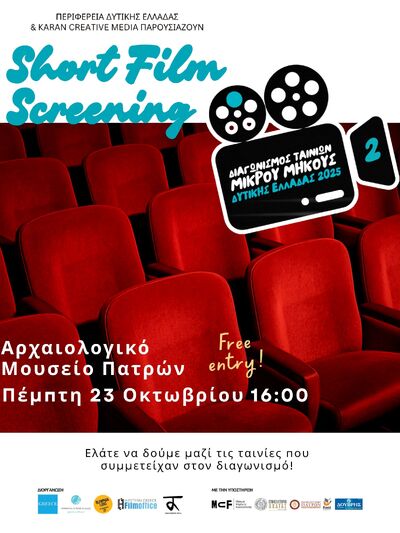 Η Περιφέρεια Δυτικής Ελλάδας, το Film Office Δυτικής Ελλάδας και η Karan Creative Media σας προσκαλούν στην Τελετή Απονομής Βραβείων του 2ου Διαγωνισμού Ταινιών Μικρού Μήκους Δυτικής Ελλάδας, το Σάββατο 25 Οκτωβρίου 2025, στις 18:00, στο Αρχαιολογικό Μουσείο Πατρών.