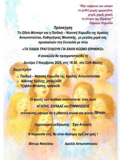Το Ωδείο Μότσαρτ και η Παιδική- Νεανική Χορωδία της Αμαλίας Αντωνοπούλου παρουσιάζουν τη συναυλία με τίτλο «Τα παιδιά τραγουδούν για έναν κόσμο ειρηνικό», μια εκδήλωση που στοχεύει να μεταφέρει μήνυμα αγάπης, ελπίδας και ενότητας μέσα από τη δύναμη της μουσικής.