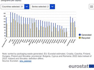 Το 2023, η ΕΕ παρήγαγε 79,7 εκατομμύρια τόνους απορριμμάτων από συσκευασίες, που ισοδυναμούν με 177,8 κιλά ανά κάτοικο