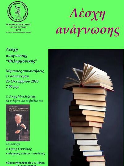 Η Λέσχη Ανάγνωσης της Φιλαρμονικής Εταιρίας Ωδείο Πατρών συνεχίζει για 2η χρονιά τις συναντήσεις ανθρώπων που αγαπούν το βιβλίο και την τέχνη,