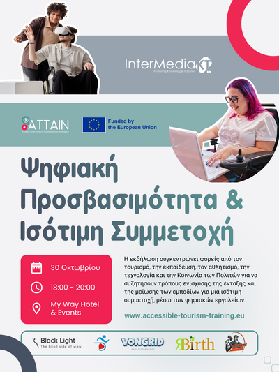 Η εκδήλωση «Ψηφιακή Προσβασιμότητα & Ισότιμη Συμμετοχή», που θα πραγματοποιηθεί την Πέμπτη 30 Οκτωβρίου 2025, από τις 18:00 έως τις 20:00 στο My Way Hotel & Events στην Πάτρα, συγκεντρώνει φορείς από τον τουρισμό, την εκπαίδευση, τον αθλητισμό, την τεχνολογία και την Κοινωνία των Πολιτών για να συζητήσουν τρόπους ενίσχυσης της ένταξης και της μείωσης των εμποδίων για μια ισότιμη συμμετοχή, μέσω των ψηφιακών εργαλείων.