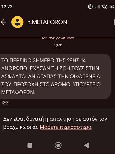 Συγκεκριμένα, το sms αναφέρει: «Το περσινό τριήμερο της 28ης 14 άνθρωποι έχασαν τη ζωή τους στην άσφαλτο. Αν αγαπάς την οικογένειά σου, προσοχή στο δρόμο. Υπουργείο Μεταφορών».