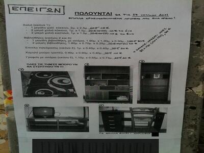 Η αυτοσχέδια και ιδιωτικής εκτύπωσης αφίσα που βλέπετε, βρίσκεται σε πολλά σημεία στο κέντρο της πόλης. Από το ανορθόγραφο κείμενο και το είδος των επίπλων που πωλούνται, βγάζουμε το συμπέρασμα ότι φοιτητής στην Πάτρα τελείωσε τις σπουδές του και φεύγει, θέλοντας να πουλήσει τα… υπάρχοντά του.