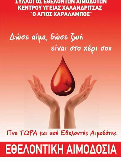 Οι εποχές αλλάζουν αλλά η ανάγκη για ζωή παραμένει. Ο Σύλλογος Εθελοντών αιμοδοτών Κέντρου Υγείας Χαλανδρίτσας “Ο Άγιος Χαράλαμπος”σε συνεργασία με το τμήμα Αιμοδοσίας του Γ.Ν.Π "Ο Άγιος Ανδρέας" και την Περιφέρεια Δυτικής Ελλάδος καλωσορίζει τον Νοέμβρη με εθελοντική αιμοδοσία που θα γίνει το Σάββατο 1η του μήνα.