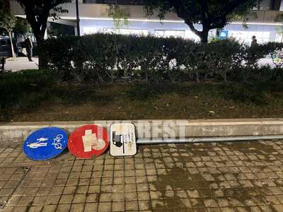 Πεσμένη στο έδαφος βρίσκεται πινακίδα στον πεζόδρομο της Τριών Ναυάρχων, στο κέντρο της Πάτρας.