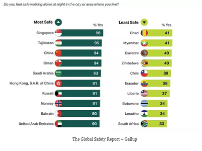 Στην έκδοση του Global Safety Report για το 2025, μόνο μία ευρωπαϊκή χώρα καταφέρνει να βρεθεί στην πρώτη δεκάδα των χωρών με το υψηλότερο αίσθημα ασφάλειας: η Νορβηγία, με ποσοστό 91%.