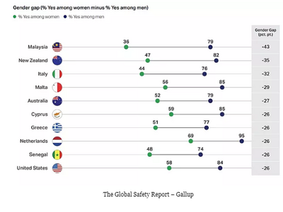 Πέντε από τις δέκα χώρες με τη μεγαλύτερη ψαλίδα ανάμεσα στα φύλα είναι μέλη της Ευρωπαϊκής Ένωσης. Η Ιταλία εμφανίζει τη μεγαλύτερη διαφορά στην Ευρώπη, με 32 ποσοστιαίες μονάδες διαφορά ανάμεσα στην αίσθηση ασφάλειας των ανδρών (76%) και των γυναικών (44%) που περπατούν μόνες τη νύχτα.