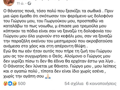 «Ο θάνατος πονά, τόσο πολύ που ξεσκίζει τα σωθικά. Πριν μια ώρα έμαθα ότι σκότωσαν τον φερόμενο ως δολοφόνο του Γιώργου μου, του Γιωργούκου μου, προσπαθώ να καταλάβω το πώς νιώθω, μ’ έπιασε μια τρεμούλα μου κόπηκαν τα πόδια είναι σαν να ξαναζώ τη δολοφονία του Γιώργου μου όλα γυρνούν στο κεφάλι μου, σαν να ξαναζώ την παραζάλη εκείνου του μεσημεριού που ακροβατούσα ανάμεσα στο χάος και στην απέραντη θλίψη», αναφέρει στην ανάρτησή της και προσθέτει: