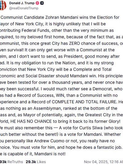 «Αν ο κομμουνιστής υποψήφιος Ζοχράν Μαμντάνι κερδίσει τις εκλογές για δήμαρχος της Νέας Υόρκης, είναι εξαιρετικά απίθανο να συνεισφέρω ομοσπονδιακά κονδύλια, πέραν του ελάχιστου απαιτούμενου ποσού, στην αγαπημένη μου πρώτη πατρίδα», έγραψε ο Τραμπ σε ανάρτησή του στο Truth Social.