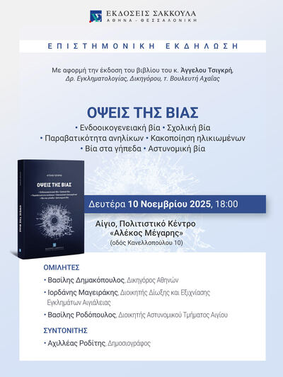 Τη Δευτέρα 10 Νοεμβρίου 2025 και ώρα 6 μμ, θα παρουσιαστεί στο Αίγιο το νέο βιβλίο του Αχαιού εγκληματολόγου και πολιτικού Άγγελου Τσιγκρή με τίτλο: “Όψεις της Βίας”, το οποίο κυκλοφόρησε πρόσφατα από τις εκδόσεις Σάκκουλα.