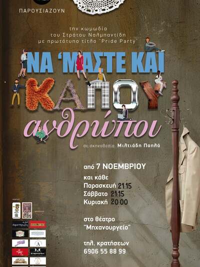 Τη νέα δουλειά των «Υποκριτών» δεν θα αργήσουμε να τη δούμε καθώς την Παρασκευή 7 Νοεμβρίου, κάνει πρεμιέρα η φαρσοκωμωδία «Να ’μαστε και κάπου ανθρώποι», ένα έργο του Στράτου Ναλμπαντίδη, στο θεάτρο Μηχανουργείο.