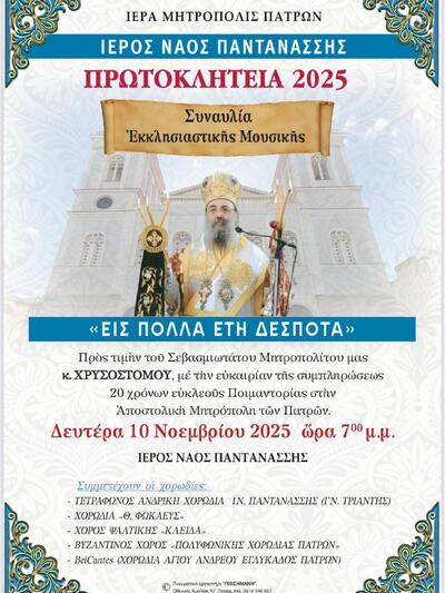 Συναυλία εκκλησιαστικής μουσικής για τα 20 χρόνια που συμπλήρωσε φέτος ως Μητροπολίτης Πατρών ο κ.κ. Χρυσόστομος, θα πραγματοποιηθεί τη Δευτέρα 10-11-2025 στον Ιερό Ναό Παντανάσσης στις 19.00 στο πλαίσιο των φετινών Πρωτοκλητείων.