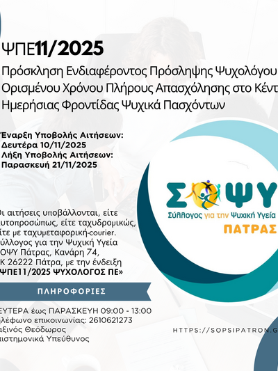 Το Σωματείο Μη Κερδοσκοπικού Χαρακτήρα «Σύλλογος για τη Ψυχική Υγεία – ΣΟΨΥ Πάτρας», διαχειριστής της Μονάδας Ψυχοκοινωνικής Αποκατάστασης «Κέντρο Ημερήσιας Φροντίδας Ψυχικά Πασχόντων – Γέφυρες Ζωής» (βάσει της Γ3β/Γ.Π./72320) προτίθεται να προβεί όπως αναφέρει σχετική ανακοίνωση, στη σύναψη μίας (1) σύμβασης ορισμένου χρόνου πλήρους απασχόλησης Ψυχολόγου ΠΕ διάρκειας 6 μηνών με δυνατότητα ανανέωσης, για τη στελέχωση του Κέντρου Ημέρας.