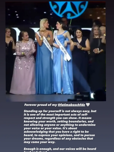 Μετά το επεισόδιο, η Θίλβινγκ ανέβασε μια φωτογραφία της μαζί με την Μπος στη σκηνή των καλλιστείων Miss Universe γράφοντας: «Πάντα περήφανη για την @fatimaboschfdz μου. Το να υπερασπίζεσαι τον εαυτό σου δεν είναι πάντα εύκολο, αλλά είναι μια από τις πιο σημαντικές πράξεις αυτοσεβασμού και δύναμης που μπορείς να δείξεις. Σημαίνει να γνωρίζεις την αξία σου, να θέτεις όρια και να μην επιτρέπεις σε κανέναν και σε τίποτα να υπονομεύσει τη φωνή ή την αξία σου. Σημαίνει να αναγνωρίζεις ότι έχεις το δικαίωμα να ακουστείς, να εκφράσεις τις απόψεις σου και να κυνηγήσεις τα όνειρά σου, ανεξάρτητα από τα εμπόδια που μπορεί να συναντήσεις. Αρκετά πια, οι φωνές μας θα ακουστούν δυνατά και καθαρά!»