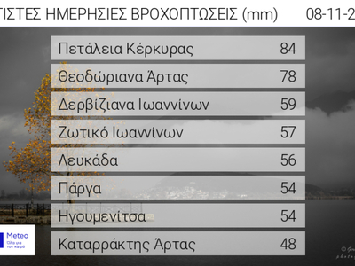 Αξιόλογα ύψη βροχής καταγράφηκαν κατά τόπους τις πρωινές ώρες του Σαββάτου 8 Νοεμβρίου 2025 στα δυτικά κυρίως σε τμήματα του Ιονίου και της Ηπείρου. Το μεγαλύτερο ύψος βροχής σύμφωνα με το δίκτυο αυτόματων μετεωρολογικών σταθμών του meteo.gr / Εθνικού Αστεροσκοπείου Αθηνών καταγράφηκε στην Πετάλεια Κέρκυρας με 84 mm. Στον παρακάτω πίνακα παρουσιάζονται τα 8 μεγαλύτερα ύψη βροχής.