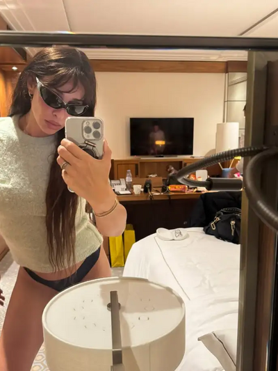 Σε δύο από τις φωτογραφίες η Ελένη Φουρέιρα, μάλιστα, είναι τόπλες: στη μια απολαμβάνει ένα φρούτο σε διάλειμμα από τις εμφανίσεις της και στη δεύτερη ποζάρει έξω από την είσοδο ενός κτηρίου.