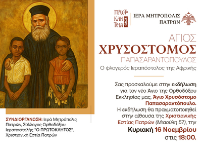 Η Ιερά Μητρόπολη Πατρών, ο Σύλλογος Ορθοδόξου Ιεραποστολής "Ο Πρωτόκλητος" και η Χριστιανική Εστία Πατρών προσκαλούν το κοινό στην εκδήλωση για τον νέο Άγιο της Ορθοδόξου Εκκλησίας μας Άγιο Χρυσόστομο Παπασαραντόπουλο, τον φλογερό ιεραπόστολο της Αφρικής.