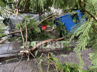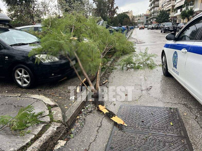 Ένα δέντρο που ξεριζώθηκε από το πάρκινγκ της οδού Κορίνθου κατέπεσε πάνω σε διερχόμενο όχημα, προκαλώντας πανικό στον οδηγό.