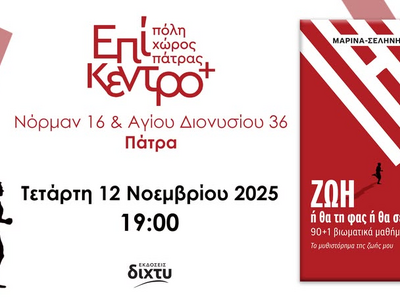 Οι εκδόσεις Δίχτυ σας προσκαλούν στην παρουσίαση του βιβλίου "Ζωή – Ή θα την φας ή θα σε φάει" της Μαρίνας - Σελήνης Κατσαΐτη, την Τετάρτη 12 Νοεμβρίου 2025 στις 7:00μμ στον πολιτιστικό χώρο Επίκεντρο+, Νόρμαν 16 και Αγίου Διονυσίου 36 στην Πάτρα.