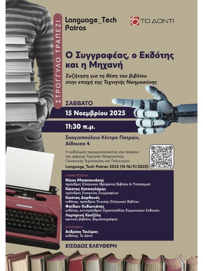 Οι εκδόσεις Το Δόντι διοργανώνουν το Σάββατο 15 Νοεμβρίου 2025, ώρα 11:30 π.μ. στο Σκαγιοπούλειο Κέντρο Πατρών στρογγυλό τραπέζι με θέμα «Ο Συγγραφέας, ο Εκδότης και η Μηχανή» για τη θέση και το μέλλον του βιβλίου στην εποχή της Τεχνητής Νοημοσύνης.