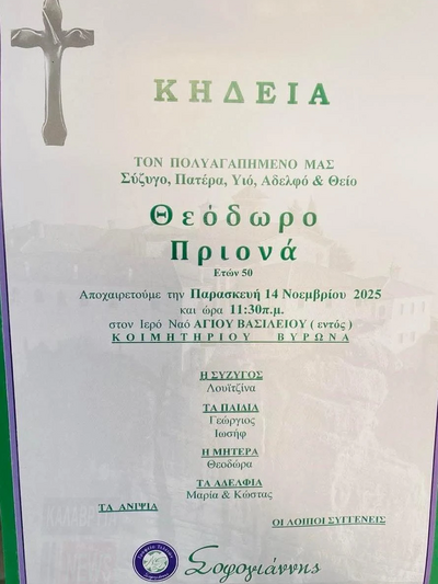 Με βαθιά θλίψη η οικογένεια ανακοίνωσε τον θάνατο του Θεόδωρου Πριονά, από τους Κραστικούς Καλαβρύτων, ο οποίος έφυγε από τη ζωή σε ηλικία 50 ετών.