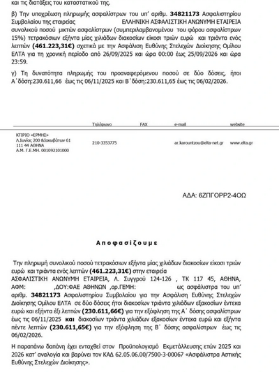 Πρόκειται για ασφάλιση ευθύνης στελεχών διοίκησης ομίλου ΕΛΤΑ για τη χρονική περίοδο από 26/09/2025 και ώρα 00:00 έως 25/09/2026 και ώρα 23:59. Δηλαδή κάλυπτε τις τελευταίες 40 κρίσιμες μέρες του Γρηγόρη Σκλύκα στη διοίκηση των ΕΛΤΑ ασφαλίζοντας τον ίδιο, τα μέλη του διοικητικού συμβουλίου και τους γενικούς διευθυντές - περίπου 15 άτομα - για ευθύνη στελεχών διοίκησης ομίλο.