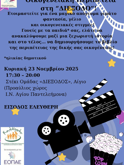 Η Εθελοντική Ομάδα Πρόληψης «ΔΙΕΞΟΔΟΣ» Αιγίου του Κέντρου Πρόληψης των Εξαρτήσεων και Προαγωγής της Ψυχοκοινωνικής Υγείας Π.Ε. Αχαΐας «Καλλίπολις» που λειτουργεί σε συνεργασία με τον Ε.Ο.Π.Α.Ε και την υποστήριξη του Δήμου Αιγιαλείας προσκαλεί την Κυριακή 23 Νοεμβρίου 2025 και ώρα 17:30 – 20:00 οικογένειες (γονείς και παιδιά ηλικίας δημοτικού σχολείου) για να παρακολουθήσουν μαζί μια ιστορία πλούσια σε συναισθήματα, φαντασία και ανατροπές.