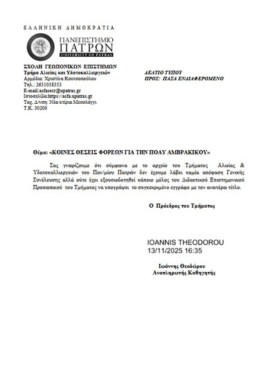 Τμήμα Αλιείας και Υδατοκαλλιεργειών Πανεπιστημίου Πατρών | Κοινές θέσεις φορέων για την ΠΟΑΥ Αμβρακικού