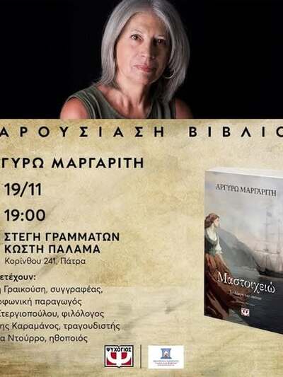 Οι εκδόσεις Ψυχογιός προσκαλούν το Πατρινό βιβλιόφιλο κοινό στην εκδήλωση παρουσίασης του νέου βιβλίου της συγγραφέως Αργυρώς Μαργαρίτη με τίτλο: "Μαστοιχειώ. Το δάκρυ του σκίνου". Η εκδήλωση θα γίνει την Τετάρτη 19/11/2025 και ώρα 19:00 μμ. στην αίθουσα της Στέγης Γραμμάτων ''Κωστής Παλαμάς'' στην οδό Κορίνθου 241, στην Πάτρα.