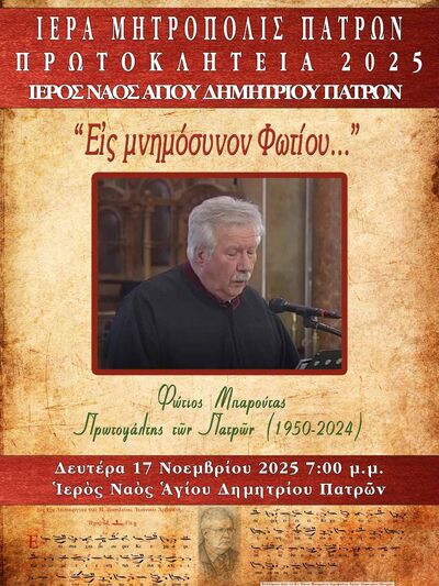 Με τίτλο "Εις Μνημόσυνον Φωτίου...", θα πραγματοποιηθεί την Δευτέρα 17 Νοεμβρίου 2025 στις 19.00 αφιερωματική εκδήλωση στον αείμνηστο πρωτοψάλτη του Ναού Αγίου Δημητρίου Πατρών και γνωστού καθηγητή μαθηματικών Φώτη Μπαρούτα (1950-2024).