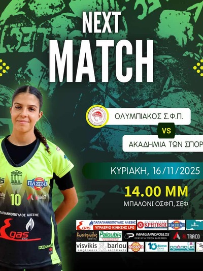 Για την πέμπτη αγωνιστική του πρωταθλήματος Α2 εθνικής κατηγορίας γυναικών χάντμπολ η ομάδα της Ακαδημίας των Σπορ θα αντιμετωπίσει ως φιλοξενούμενη την Κυριακή στις 2:00 μ.μ. στο γήπεδο Σ.Ε.Φ. (Μπαλόνι) την ομάδα του Ο.Σ.Φ. Ολυμπιακού Πειραιώς.