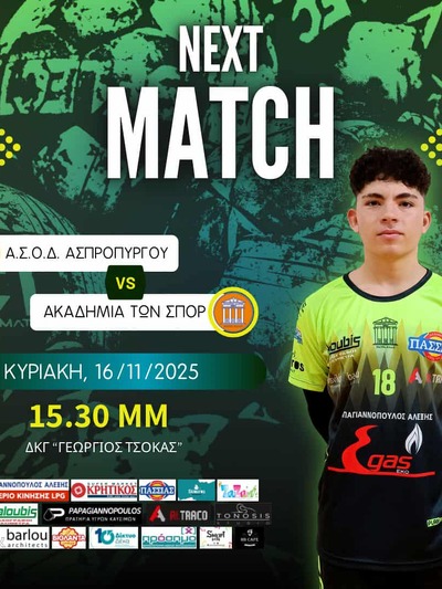 Η ανδρική ομάδα χάντμπολ του συλλόγου για την τρίτη αγωνιστική πρωταθλήματος της Β΄ εθνικής κατηγορίας ανδρών την Κυριακή στις 3:30 μ.μ.στον Ασπρόπυργο και στο κλειστό γυμναστήριο Γεώργιος Τσόκας θα αντιμετωπίσει την ομώνυμη ομάδα της πόλης ΑΣΟΔ Ασπροπύργου.