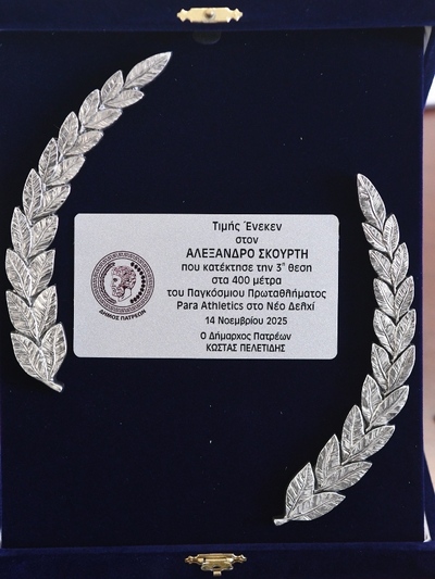 Τον Αλέξανδρο Σκούρτη, αθλητή της Ολυμπιάδας Πατρών, που κατέκτησε το Χάλκινο μετάλλιο και έκανε τρία πανευρωπαϊκά ρεκόρ στο 12ο Παγκόσμιο πρωτάθλημα Para Athletics, που πραγματοποιήθηκε στο Νέο Δελχί, καθώς και τον προπονητή του Κωνσταντίνο Λεβιδιώτη, υποδέχθηκε στο Δημαρχείο και τίμησε, ο Δήμαρχος Πατρέων Κώστας Πελετίδης.