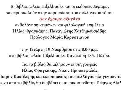 Το βιβλίο "Δεν έχουμε οξυγόνο" (εκδόσεις Εύμαρος) όπου την ανθολόγηση κειμένων και φιλολογική επιμέλεια έκαναν οι Ηλίας Φραγκάκης και Παναγιώτης Χατζημωυσιάδης, θα παρουσιαστεί σε εκδήλωση την Τετάρτη 19/11/2025 στις 20.00 στο βιβλιοπωλείο Πίξελbooks στην οδό Κανακάρη 185, στην Πάτρα.