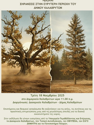 Την Τρίτη 18 Νοεμβρίου 2025, στις 11 το πρωί, ξεκινούν στο Δημαρχείο Καλαβρύτων οι εργασίες της Ημερίδας με θέμα «Ξηράνσεις στην ευρύτερη περιοχή του Δήμου Καλαβρύτων» που συνδιοργανώνουν ο Δήμος και το Δασαρχείο.