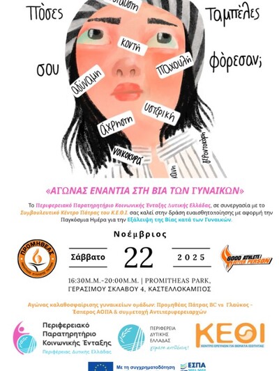 Με αφορμή την Παγκόσμια Ημέρα για την Εξάλειψη της Βίας κατά των Γυναικών (25 Νοεμβρίου), το Περιφερειακό Παρατηρητήριο Κοινωνικής Ένταξης της Περιφέρειας Δυτικής Ελλάδας, σε συνεργασία με το Συμβουλευτικό Κέντρο Πάτρας του Κέντρου Ερευνών για Θέματα Ισότητας (ΚΕΘΙ) και τους αθλητικούς συλλόγους «Προμηθέας Πατρών» και «Γλαύκος – Έσπερος ΑΟΠΑ», διοργανώνει δράση ευαισθητοποίησης με τίτλο: «Αγώνας ενάντια στη βία των γυναικών»