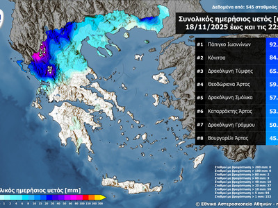 Σύμφωνα με δίκτυο αυτόματων μετεωρολογικών σταθμών του Εθνικού Αστεροσκοπείου Αθηνών / Meteo.gr τα μεγαλύτερα ύψη βροχής καταγράφηκαν στην Ήπειρο, όπως αποτυπώνεται στη χρωματική κλίματα του χάρτη, με το μεγαλύτερο ύψος βροχής μέχρι και τις 22:00 ώρα Ελλάδας να καταγράφεται στο Πάπιγκο Ιωαννίνων με 92.0 mm.