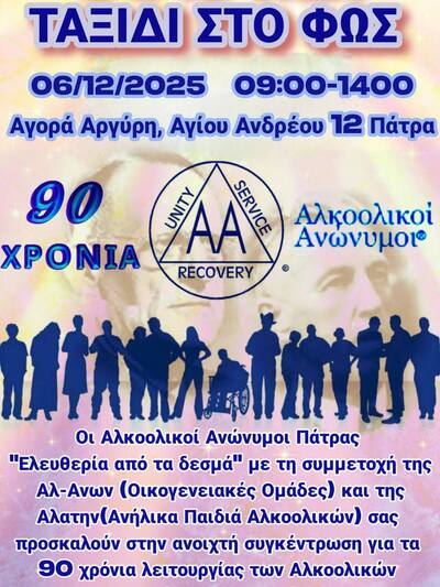 Συγκεκριμένα, σε ανακοίνωσή τους, αναφέρουν: Οι Αλκοολικοί Ανώνυμοι Πάτρας "Ελευθερία από τα δεσμά" με τη συμμετοχή της Αλ-Ανων (Οικογενειακές Ομάδες) και Αλατην (Ανήλικα Παιδιά Αλκοολικών) σας προσκαλούν στην ημερίδα που διοργανώνουν για τα 90 χρόνια λειτουργίας των Αλκοολικών Ανωνύμων παγκοσμίως. Η ημερίδα θα πραγματοποιηθεί το Σάββατο 06/12/2025 και ώρες 09:00-14:00 στην Αγορά Αργύρη, Αγίου Ανδρέου 12 στην Πάτρα.