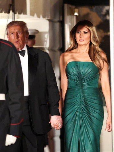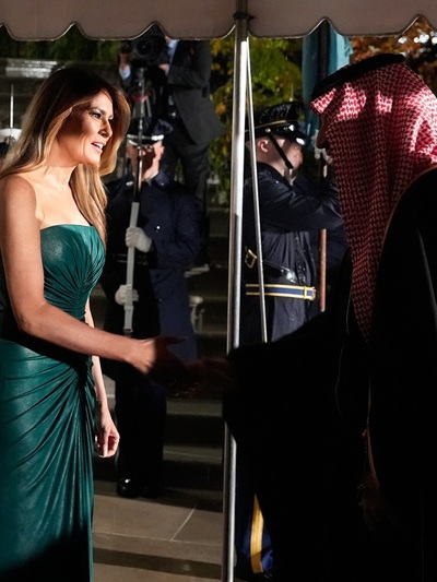 Στη συγκεκριμένη περίσταση βέβαια το χρώμα επιλέχθηκε λόγω της σημαίας της Σαουδικής Αραβίας. Η Μελάνια υποδέχθηκε τον Σαουδάραβα πρίγκιπα στο Λευκό Οίκο και το outfit τίμησε την άφιξή του.