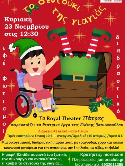 Η παράσταση σε κείμενο & σκηνοθεσία της Ελένης Βασιλοπούλου, ξεκινά την Κυριακή 23 Νοεμβρίου, στις 12:30 το μεσημέρι, στο Royal Theater Patras στην Ακτή Δυμαίων 51
