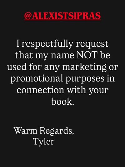 «Με όλο τον σεβασμό, ζητώ να χρησιμοποιείται το όνομά μου για οποιονδήποτε σκοπό μάρκετινγκ ή προώθησης σε σχέση με το βιβλίο σας. Με θερμούς χαιρετισμούς, Τάιλερ», γράφει στην ανάρτησή του ο σύζυγος του Στέφανου Κασσελάκη.