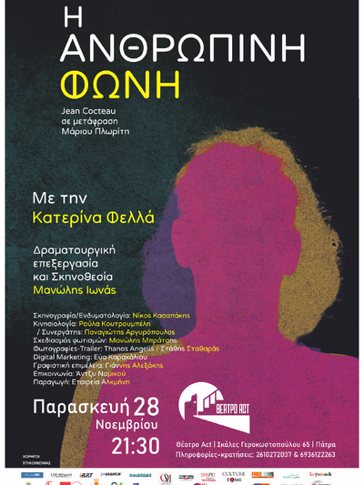 Το θέατρο act στο πάνω μέρος στις σκάλες Γεροκωστοπούλου, στην Πάτρα φιλοξενεί το θεατρικό έργο «Η Ανθρώπινη Φωνή» του Jean Cocteau, ένα αριστουργηματικό μονόπρακτο και ένα από τα πιο ευαίσθητα και διαχρονικά κείμενα του 20ού αιώνα, που επανέρχεται στη σκηνή μέσα από μια συγκλονιστική ερμηνεία της Κατερίνας Φελλά.