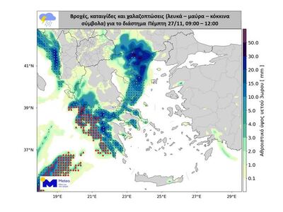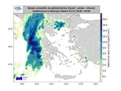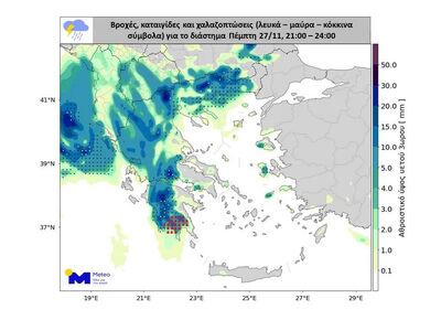 Την Πέμπτη 27/11 έντονες και τοπικά πολύ έντονες βροχοπτώσεις και καταιγίδες θα εκδηλώνονται κατά περιόδους στα Επτάνησα, στα δυτικά ηπειρωτικά, στην Πελοπόννησο, στην Ανατολική Μακεδονία και στη Θράκη, συνοδευόμενα κατά τόπους από χαλαζοπτώσεις. Επισημαίνεται ότι στα Επτάνησα, στα δυτικά ηπειρωτικά και δευτερευόντως στην Πελοπόννησο το χαλάζι ενδέχεται να έχει σχετικά μεγάλο μέγεθος. Στην υπόλοιπη χώρα θα εκδηλωθούν επίσης βροχές και σποραδικές καταιγίδες, με παροδικά έντονα φαινόμενα. Στις περιοχές που θα επηρεαστούν συμπεριλαμβάνονται οι πόλεις της Αθήνας και της Θεσσαλονίκης.