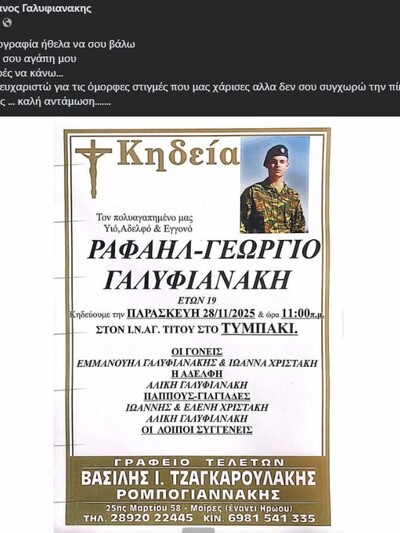 Η κηδεία του 19χρονου θα πραγματοποιηθεί την Παρασκευή 28 Νοεμβρίου. Ο τελευταίος αποχαιρετισμός θα δοθεί στις 11 το πρωί, στον Ιερό Ναό Αγίου Τίτου, στο Τυμπάκι, με συγγενείς και φίλους να συγκεντρώνονται για να πουν το τελευταίο αντίο στον Ραφαήλ.