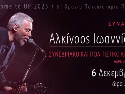 Η αναβληθείσα συναυλία του Αλκίνοου Ιωαννίδη στο πλαίσιο του Welcome to Up 2025 powered by ΔΕΗ, πραγματοποιείται το Σάββατο 6 Δεκεμβρίου στο Συνεδριακό και Πολιτιστικό Κέντρο του Πανεπιστημίου Πατρών, με αφορμή την επέτειο των 61 χρόνων του Πανεπιστημίου Πατρών.