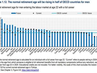 Η κανονική ηλικία συνταξιοδότησης (έξοδος με πλήρη σύνταξη) θα αυξηθεί κατά μέσο όρο στον ΟΟΣΑ από 64,7 και 63,9 έτη για άνδρες και γυναίκες, αντίστοιχα, που συνταξιοδοτήθηκαν το 2024 σε 66,4 και 65,9 έτη, αντίστοιχα, για άτομα που ξεκινούν την καριέρα τους το 2024, βάσει της ισχύουσας νομοθεσίας.