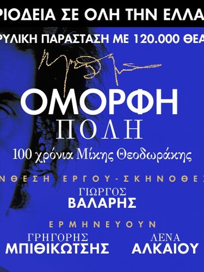 Η μουσικοθεατρική παράσταση "Όμορφη Πόλη – 100 χρόνια Μίκης Θεοδωράκης" παρουσιάζεται σε περιοδεία σε όλη την Ελλάδα, στο πλαίσιο του Αφιερωματικού Έτους Μίκη Θεοδωράκη & το Σάββατο 29 Νοεμβρίου 2025 σταθμεύει στην Πάτρα στο θέατρο Πάνθεον στη Δημ. Γούναρη και Κανακάρη. Θα δοθούν 2 παραστάσεις τις ώρες: 18:30 και 21:00.